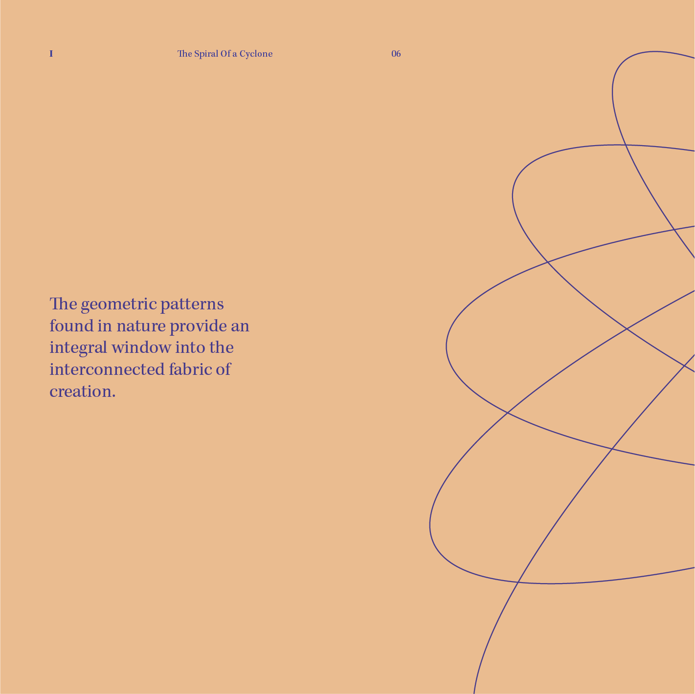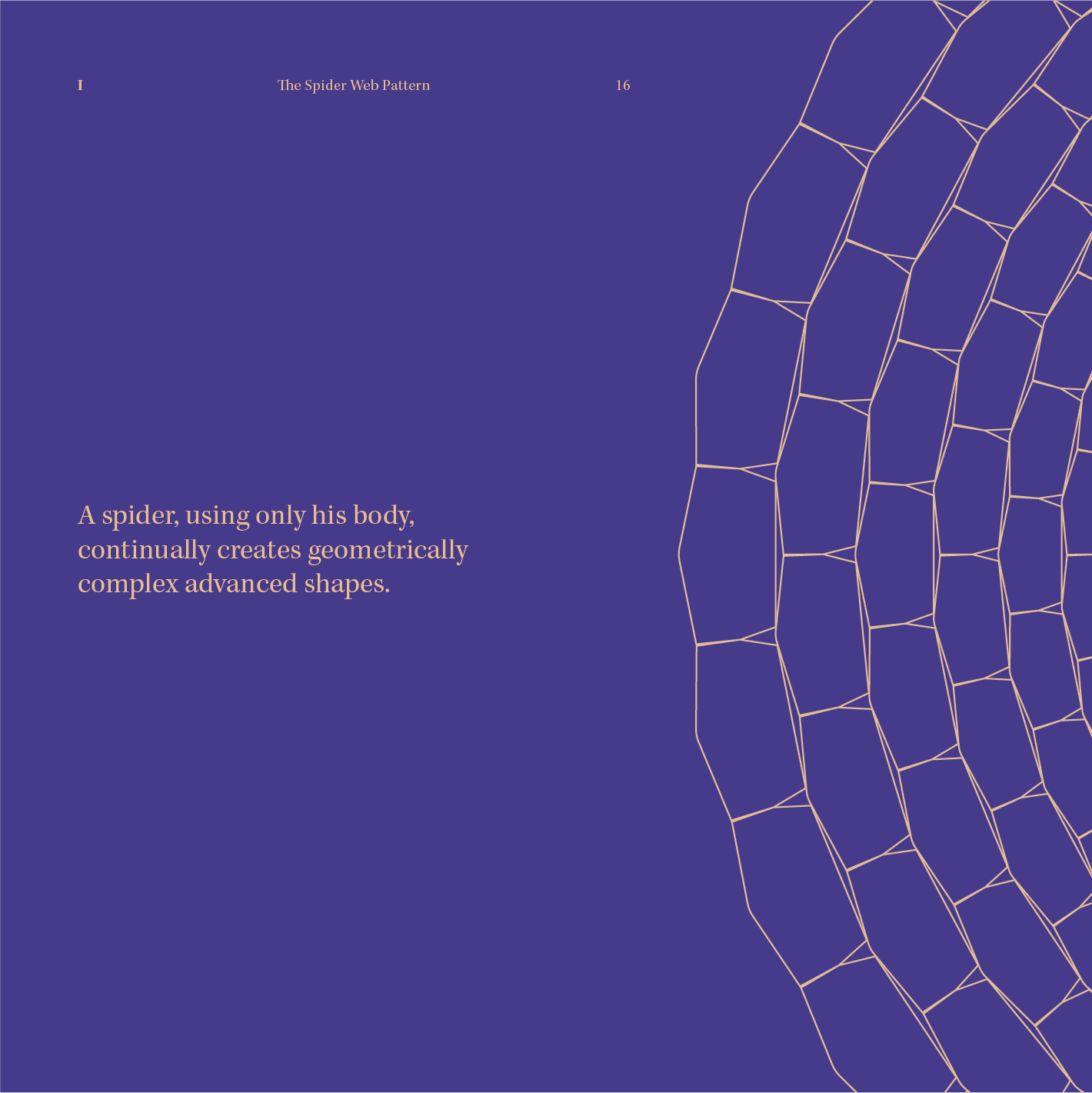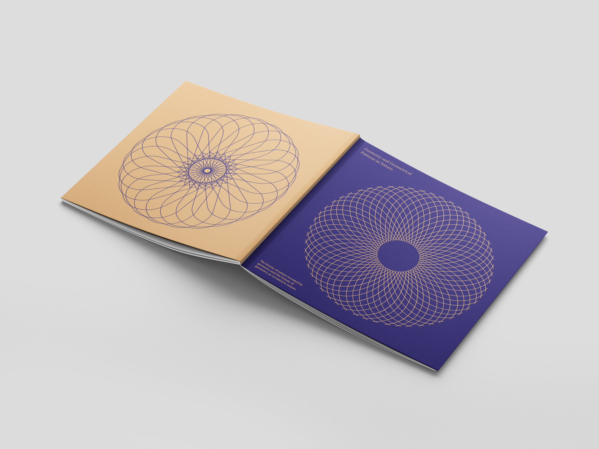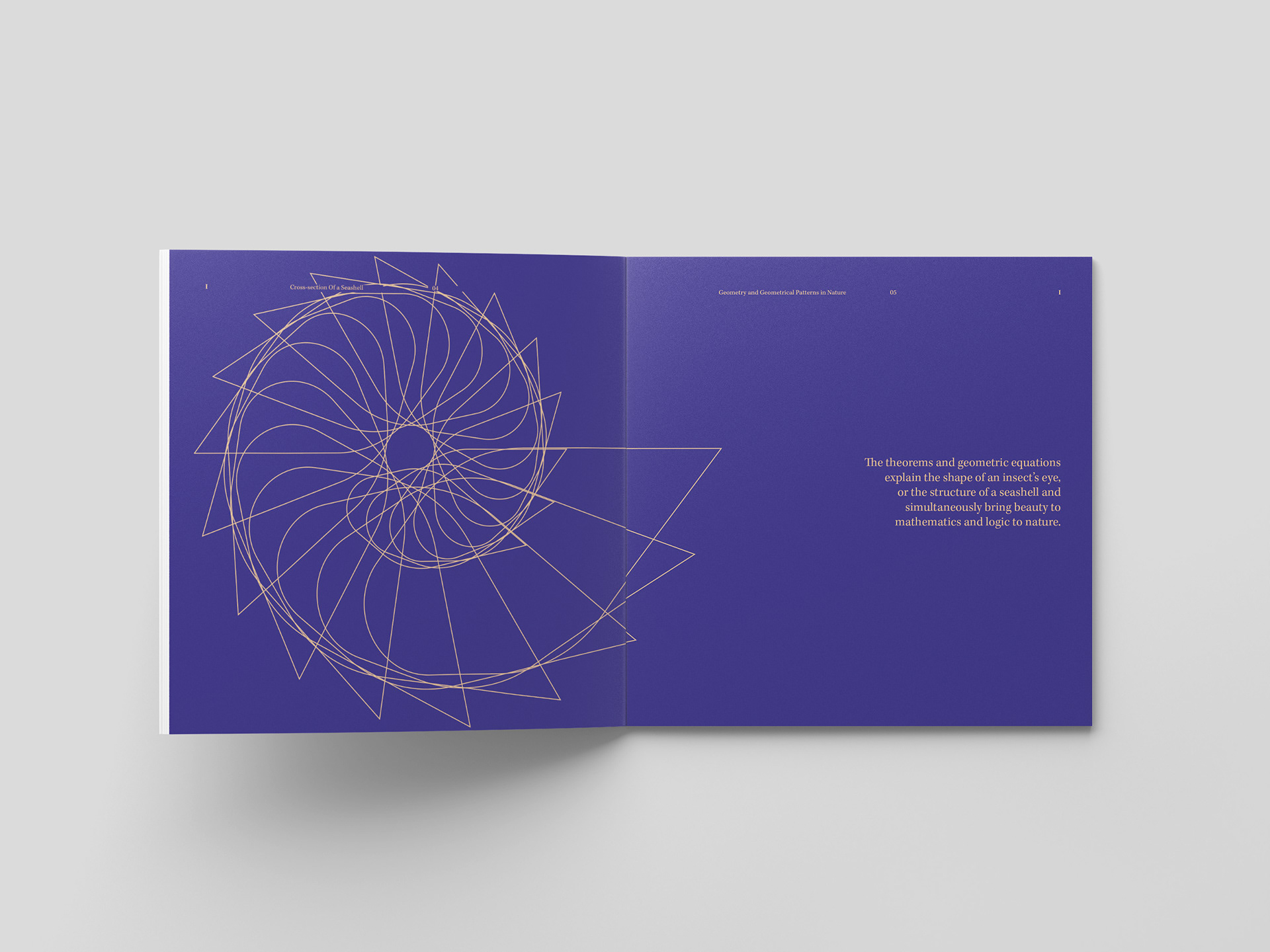 The main concept explored in this booklet is geometry and its interaction with elements of nature. Various patterns are elaborated to express this geometry, such as the intricate designs found in a spider’s web or the shape of a shell.
