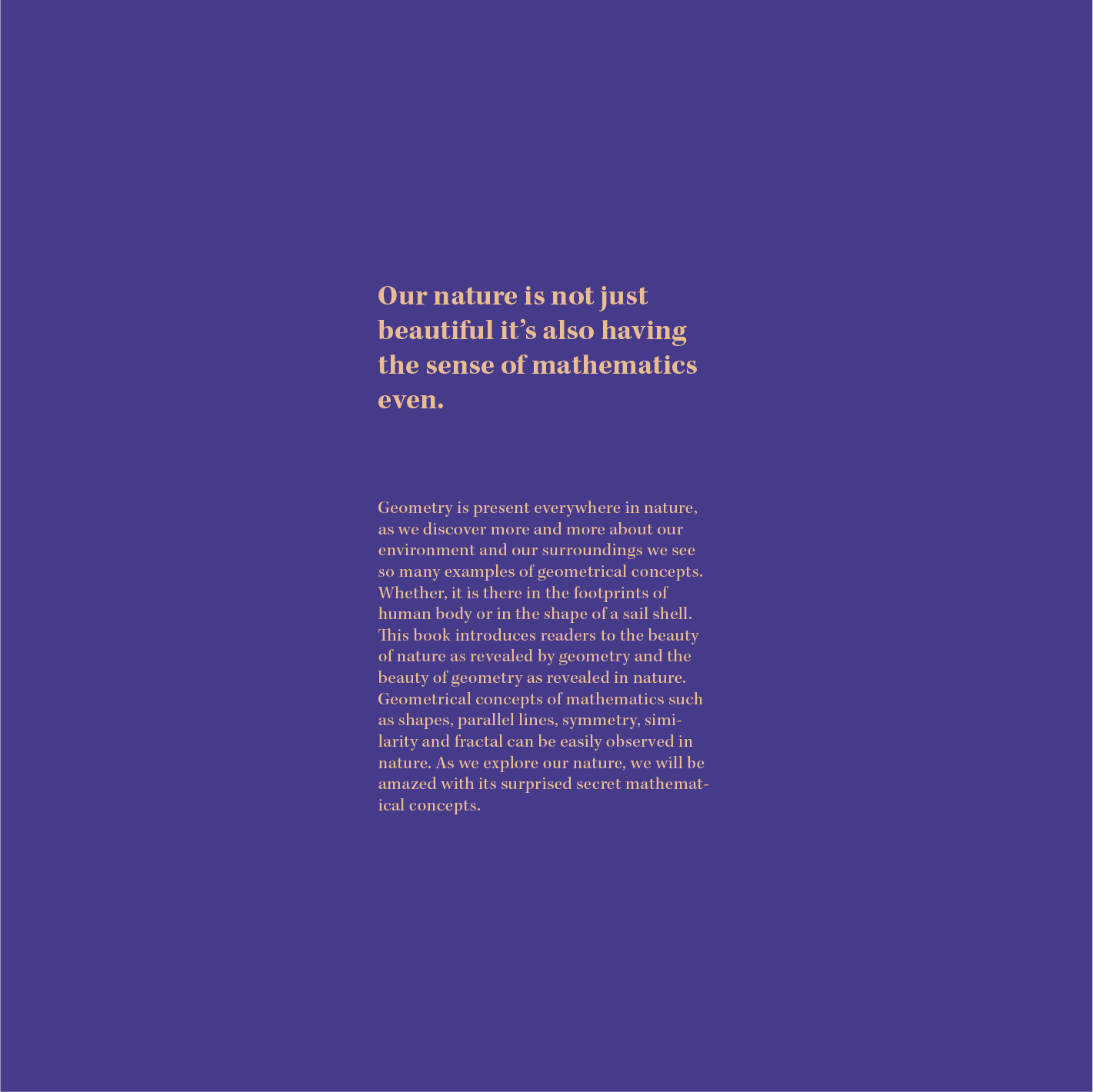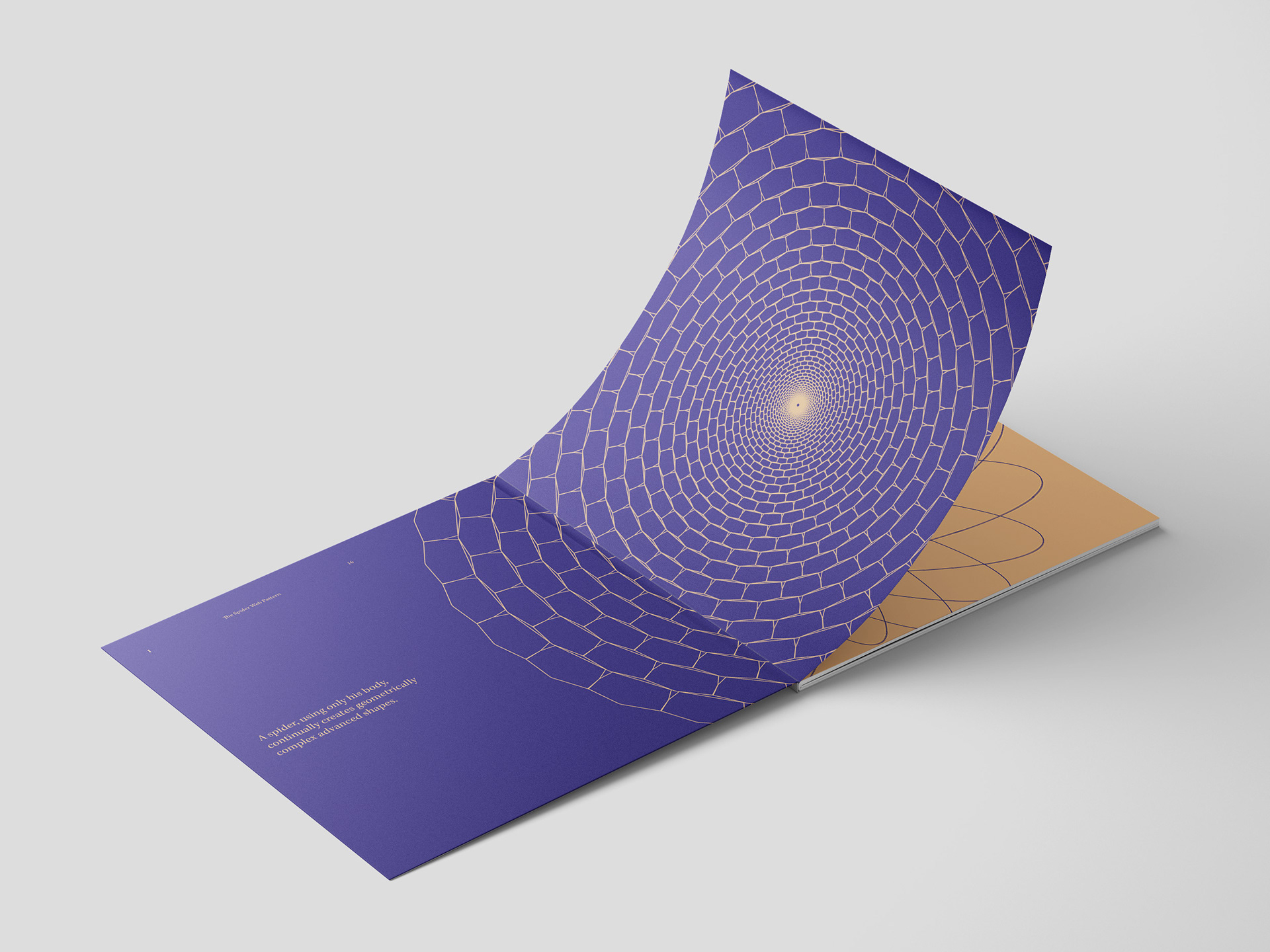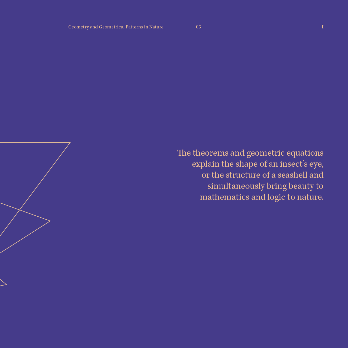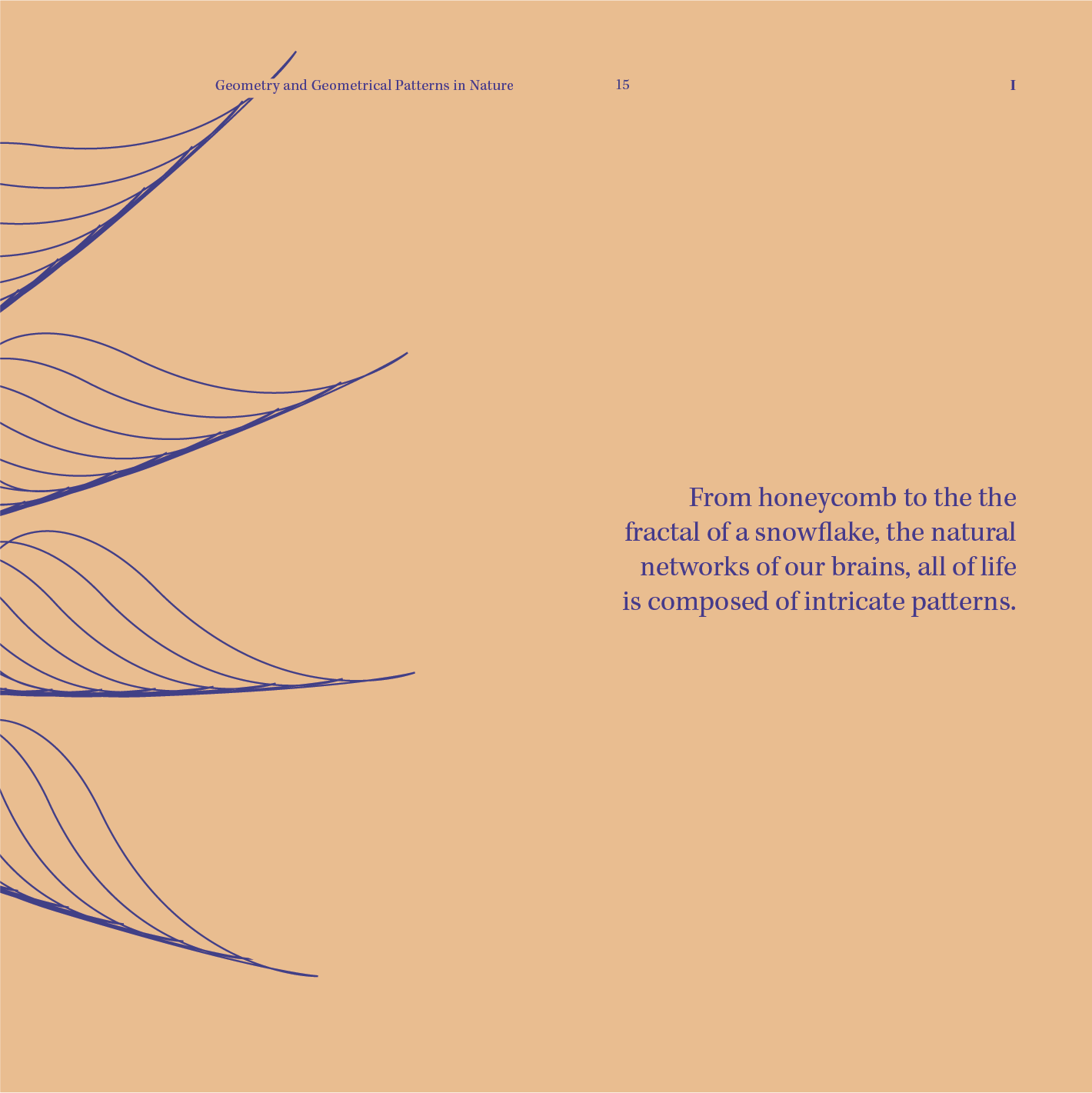 The main concept explored in this booklet is geometry and its interaction with elements of nature. Various patterns are elaborated to express this geometry, such as the intricate designs found in a spider’s web or the shape of a shell.