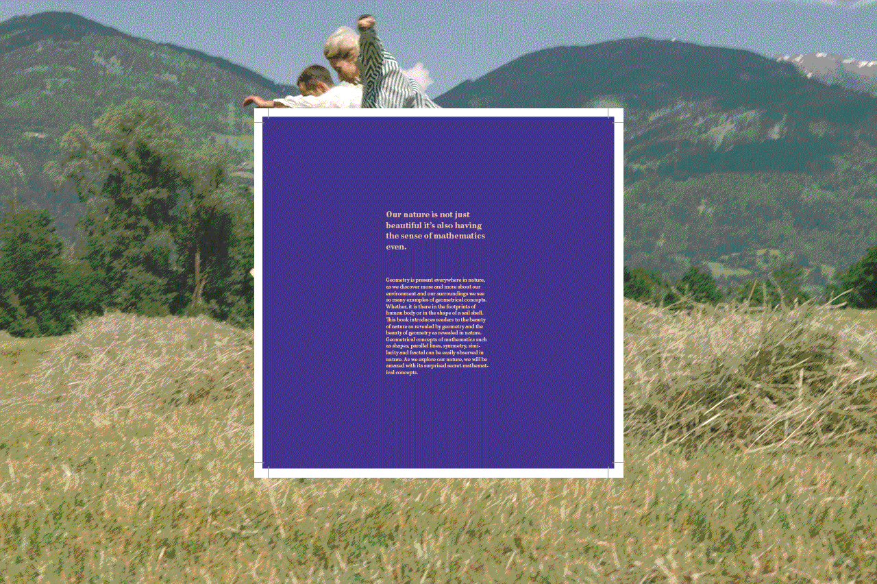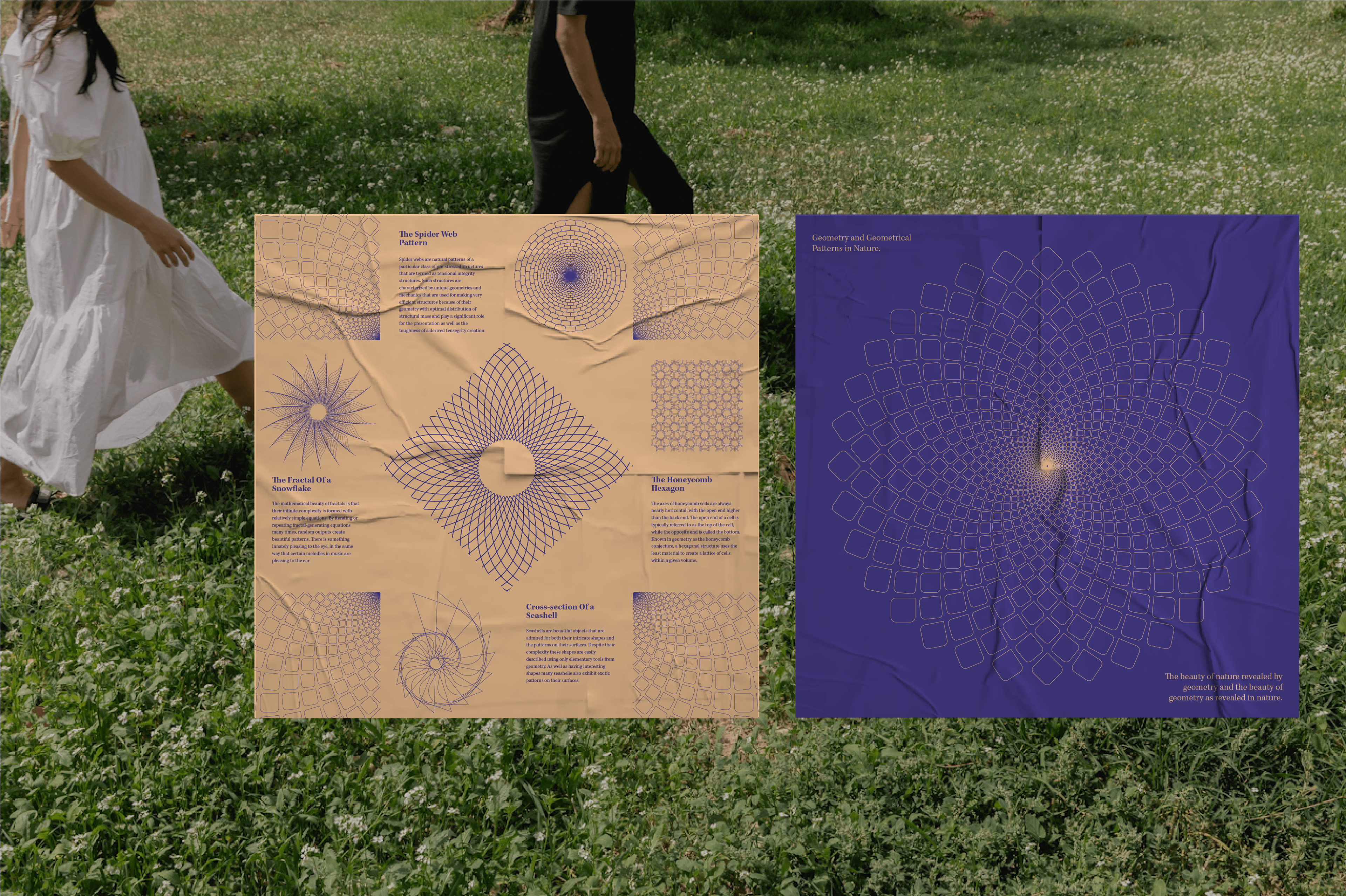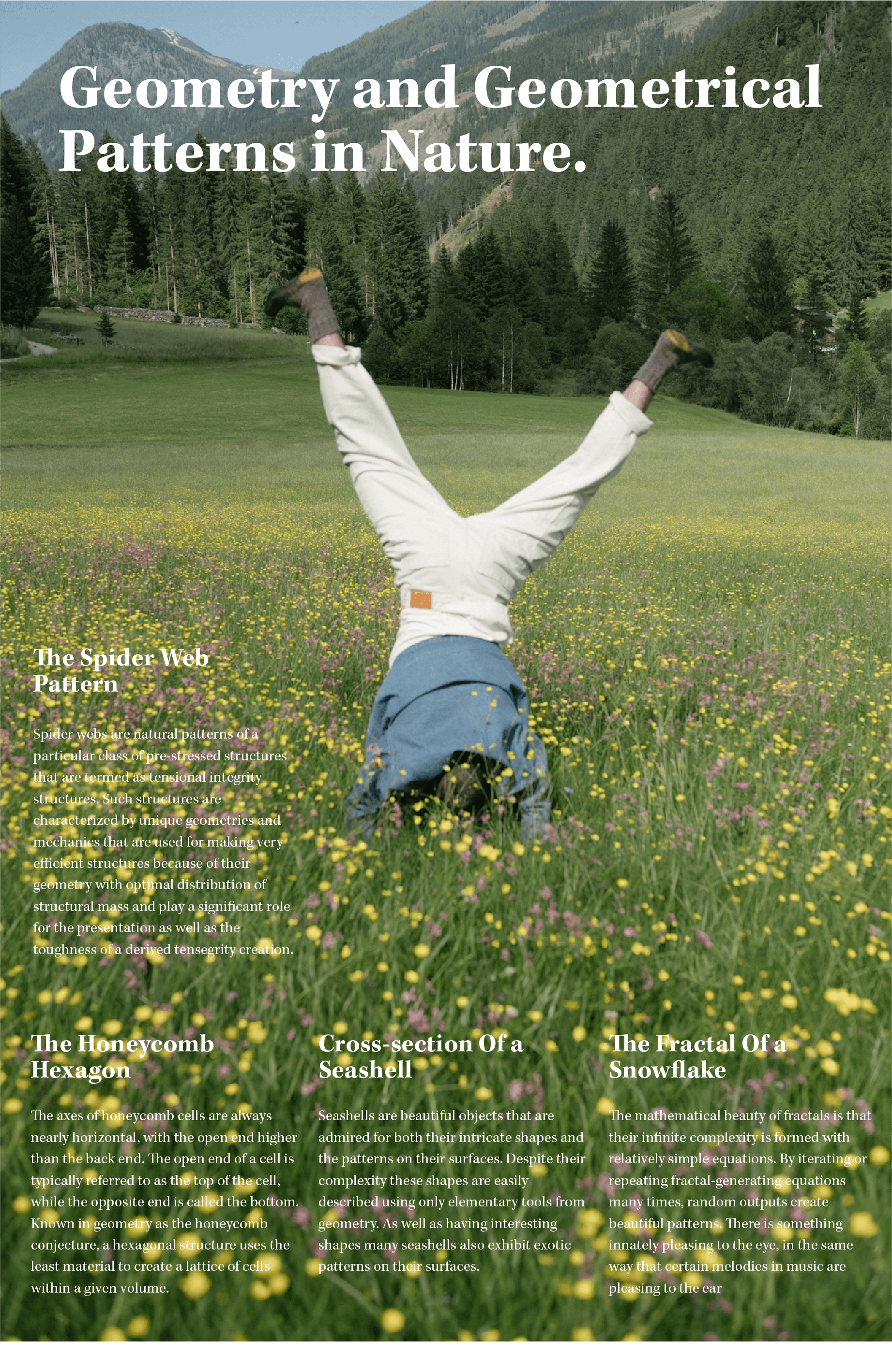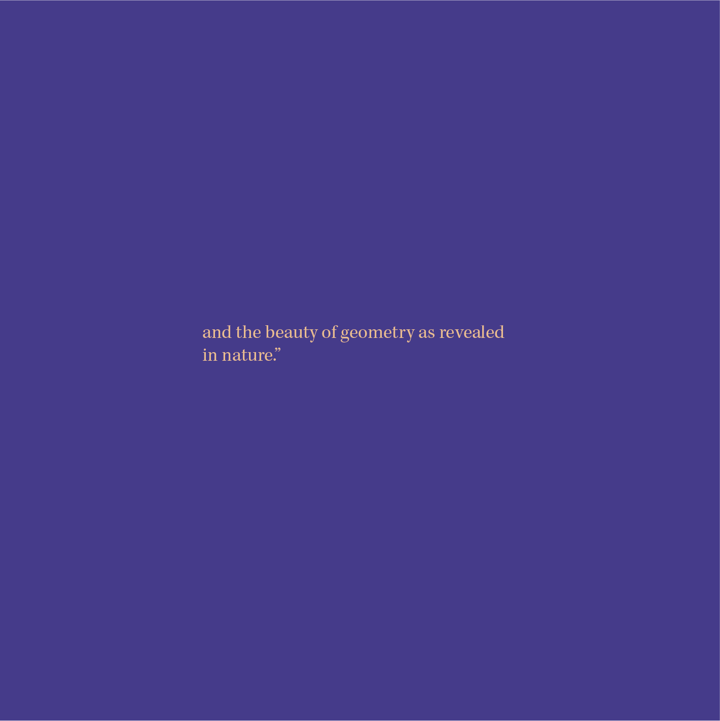 The main concept explored in this booklet is geometry and its interaction with elements of nature. Various patterns are elaborated to express this geometry, such as the intricate designs found in a spider’s web or the shape of a shell.